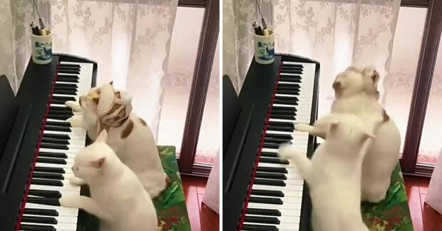 Два кота, словно музыканты, колдовали над клавишами старинного фортепиано. Один, увлеченный мелодией, самозабвенно перебирал лапками, извлекая из инструмента причудливые звуки. Другой же, видимо, сфальшивил, нарушив гармонию момента.