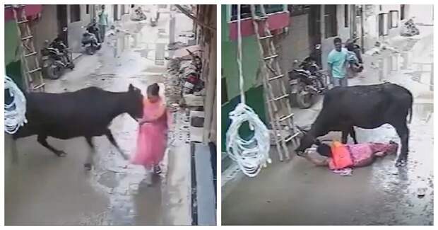 Дикий зверь повалил на землю пенсионерку и попытался растоптать её копытами, но подоспевшие случайные прохожие спасли женщину.