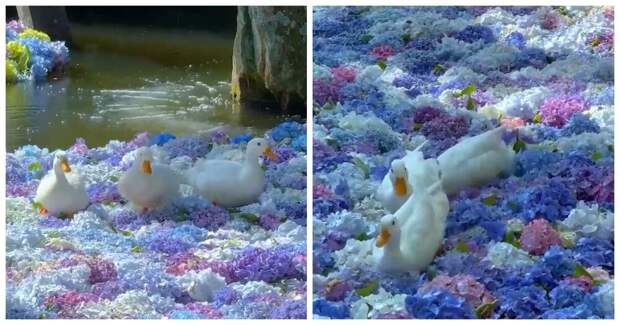 Отвлекитесь ненадолго от своих дел и посмотрите, как утки в Японии гуляют по ковру из гортензий.