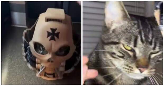 Хозяин кота сделал питомцу шлем в стиле вселенной Warhammer 40000.