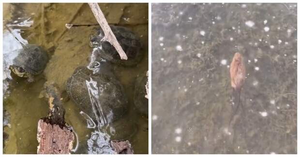 Мужчина прогулялся по льду водоёма и запечатлел подводную жизнь некоторых животных.