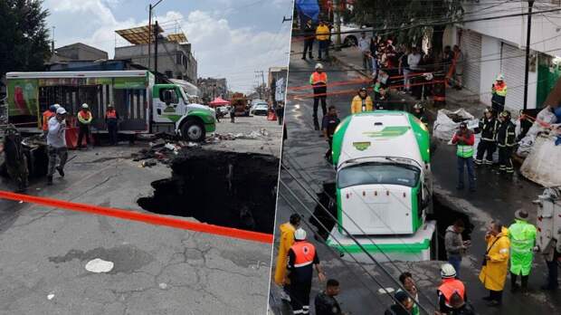В Мексике произошел инцидент, больше похожий на сцену из фильма-катастрофы. Грузовик, перевозивший лимонад, внезапно ушёл под землю. К счастью, обошлось без пострадавших.