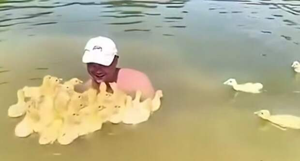 Женщина запечатлела милую сцену. Десятки утят окружили мужчину в водоёме и не спешили плыть дальше.