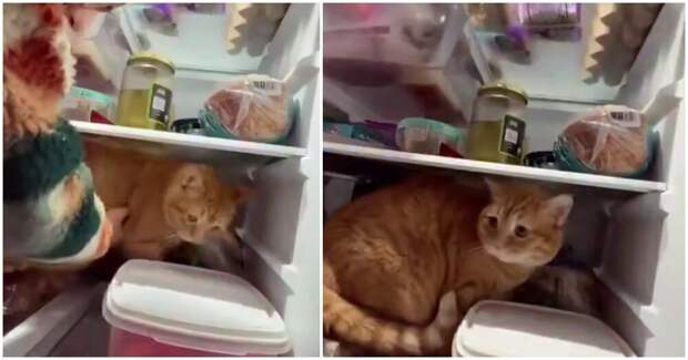 Рыжий кот решил отдохнуть на одной из полок холодильника, но хозяйка оказалась против.