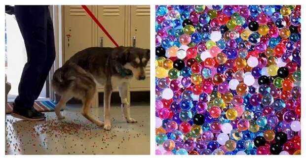 Домашний пёс проглотил большое количество цветных шариков. Четвероногого друга человека отвезли к ветеринарку и он решил избавиться от "радуги" внутри себя.
