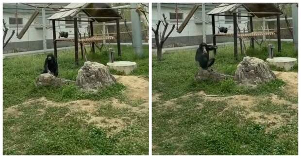 Обезьяна попросила кинуть ей банан. Она справилась с небольшой проблемой, а потом жестом поблагодарила человека.