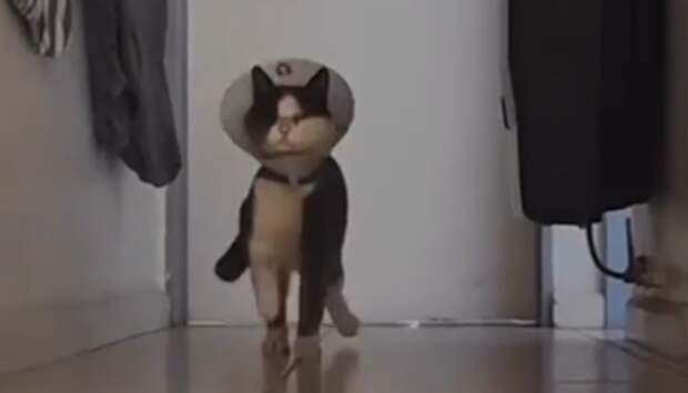 Кот недавно побывал у ветеринара и, похоже, перенёс не самые приятные процедуры. Однако пушистый герой видео не стал впадать в уныние и продемонстрировал уверенную походку.