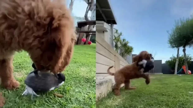 Сорока ведет себя так, словно не осознает своей пернатой природы. Она отчаянно борется за вкусняшку с псом, словно пытаясь доказать свою правоту.