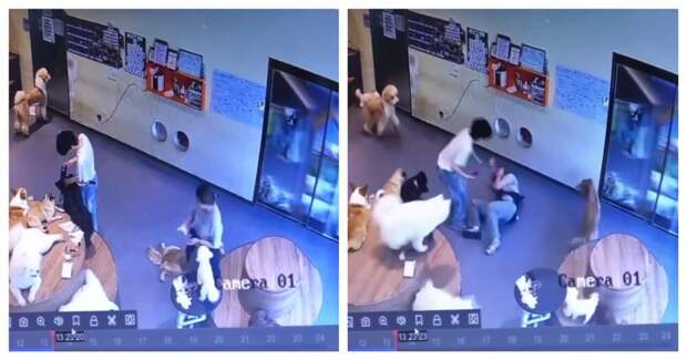 Сотрудница груминг-салона случайно споткнулась об одного из четвероногих клиентов и упала. Собаки в салоне тут же побежали проверять, всё ли в порядке с девушкой.