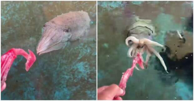 Японский рыбак поселил каракатицу в бассейне и теперь снимает видеоролики с кормёжкой. Видео с необычным питомцем набирает популярность в сети