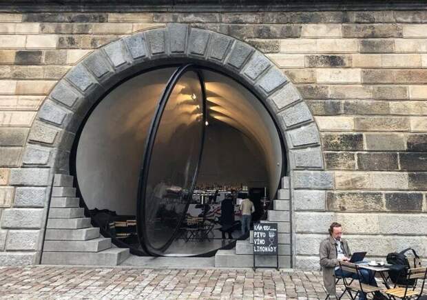 В Праге нашли кофейню с одной из самых необычных дверей в мире. В стальную раму вставлено стекло диаметром 5,5 м и толщиной 7 см. Дверь весит около 2,5 тонн, открывается и закрывается электроприводом и сочетает в себе функции окна и поворотного механизма.