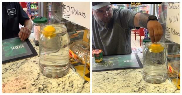 Задача — положить монету на лимон так, чтобы он не перевернулся и монета не упала на дно. Победитель забирает все монеты.