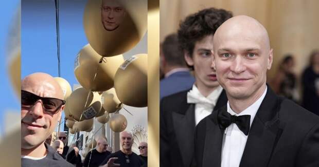 В ролике лысые мужчины стоят посреди улицы с золотистыми шариками, на которых изображен портрет российского артиста. Они одеты во все черное, подобно герою Борисова в драмеди «Анора».