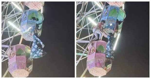 В одном из парков Индии женщина выпала из кабинки «колеса обозрения» и несколько минут висела на руках на высоте 10 метров от земли. Кабинка уже опускалась, как вдруг аттракцион внезапно начал вращаться в обратную сторону.