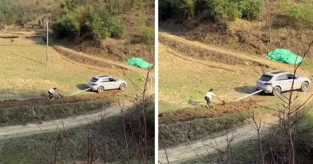 Автолюбитель превратил свой дорогой автомобиль в трактор. Используя плуг, прикрепленный к задней части машины, он обрабатывает свой участок.