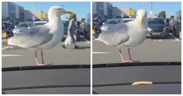 Мужчина сидел в автомобиле на парковке и дразнил чайку, которая находилась за стеклом. Он бросал картошку фри перед птицей, думая, что она не доберется до еды. Однако он ошибался.
