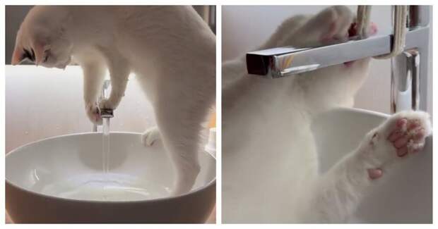 Этот кот обожает устраивать банные процедуры, разливая воду повсюду. Хозяева поставили «защиту» на кран, но смышлёный питомец всё равно смог открыть воду.