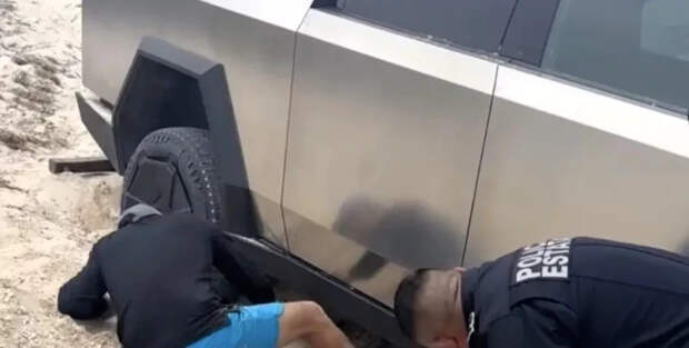 На одном из мексиканских пляжей произошла курьезная история: водитель ехал вдоль пляжа на своем Tesla Cybertruck, но застрял в песках. Тогда он на помощь вызвал копов, чтобы те откопали машину из-за грядущего прилива.