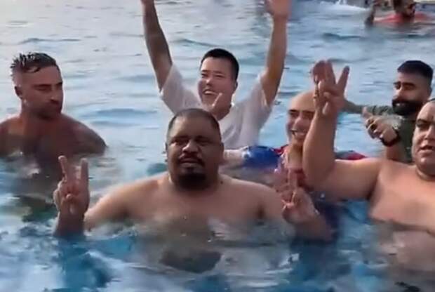 Владелец тигра решил подшутить над приятелями, делающими совместную фотографию в бассейне. Он выждал момент и выпустил хищную кошку поплавать рядом с ними.