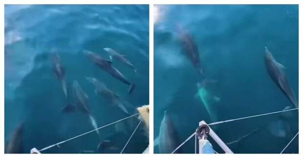 Туристы в Сочи запечатлели на видео стаю дельфинов. Животные сопроводили их плавательное средство.