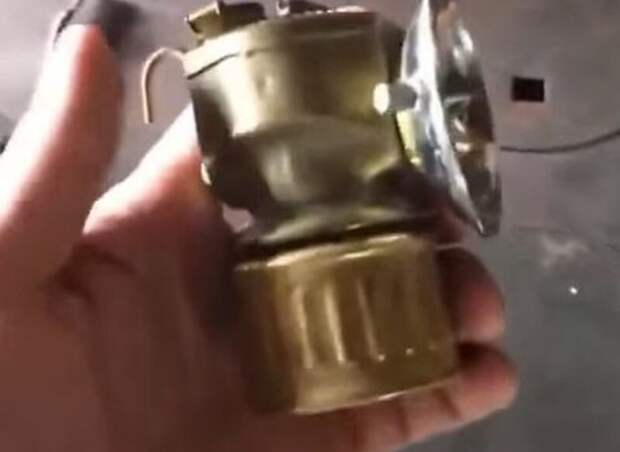 При взаимодействии карбида с водой выделяется горючий газ ацетилен. Рычажок сверху дозирует подачу воды в нижнюю камеру, где находится карбид.