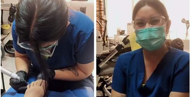 Специалистке во время работы с ногтями мешали прядь волос и очки, которые начали спадать. Когда женщина увидела неудобства мастера, то решила ей помочь — она второй ногой аккуратно схватила прядь и заложила ее за ухо специалиста.