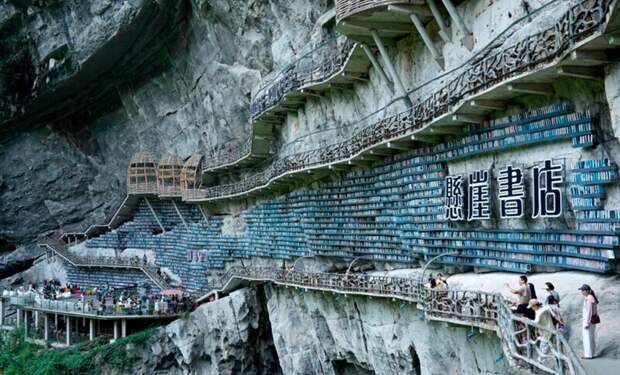 В живописной туристической зоне «Мяньхуа Тянькэн» в Китае находится необычный книжный магазин, буквально встроенный в скалу. Добираются до него по извилистым тропинкам в окружении гор.