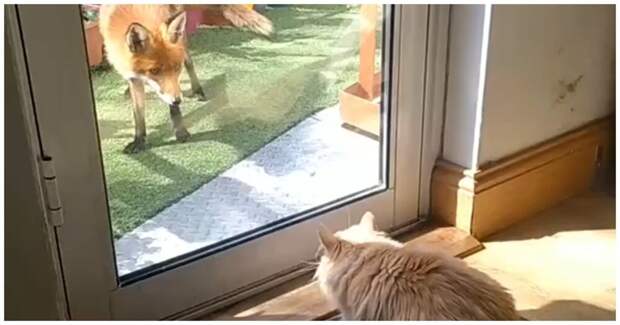 Лиса увидела за стеклянной дверью дома кошку. Лесная хищница попыталась приблизиться, но тут же поняла, что с кошкой лучше не связываться.