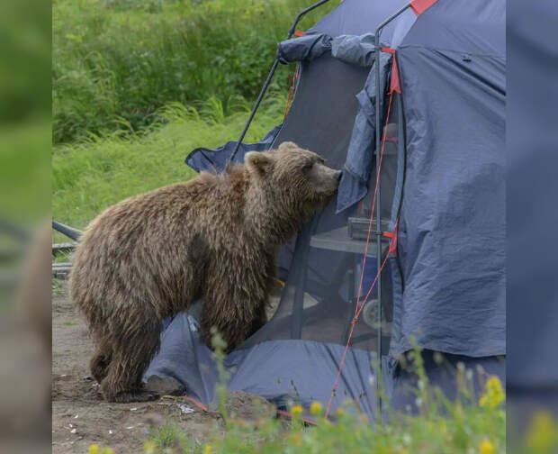 Лагерь обосновали за Вилючинским перевалом, рядом с озёрами. Молодой медведь прогулялся по территории, разорвал пакеты с продуктами и отходами, потом попытался проникнуть внутрь палаток.