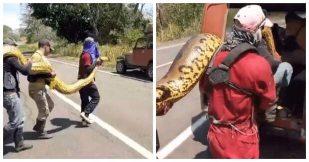 Рабочие, занимавшиеся подрезкой деревьев близ Боливара (Венесуэла), сразу поняли, что не пресмыкающееся представляет опасность, а опасности подстерегают само пресмыкающееся. На этом участке леса ведутся работы, которые вполне могли побеспокоить змею и причинить ей вред. Так что мужчины погрузили гигантское создание в машину и отвезли к озеру — там змее будет комфортно и спокойно.