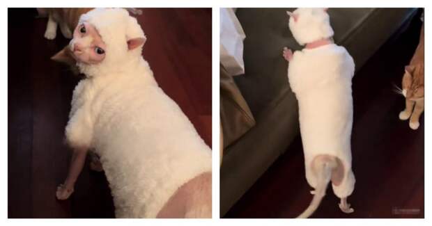Женщина купила своему коту тёплый комбинезон к осени. По словам хозяйки, сфинкс теперь похож на живую лабубу.
