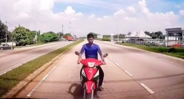 Мотоциклист ехал по дороге без шлема и всё его внимание было в смартфоне. Куала-Лумпур.