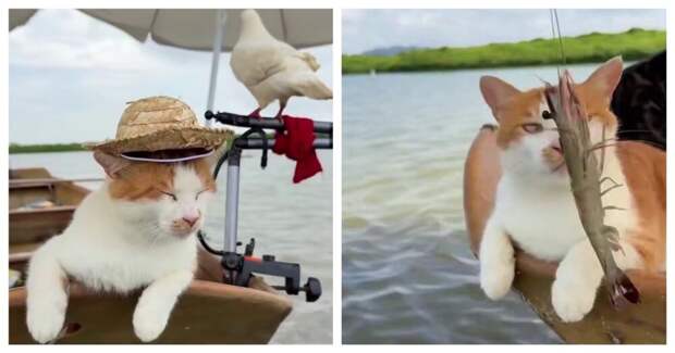 Этот мужчина никогда не отправляется на рыбалку в одиночестве. Он берёт с собой своих пушистых и пернатых питомцев.