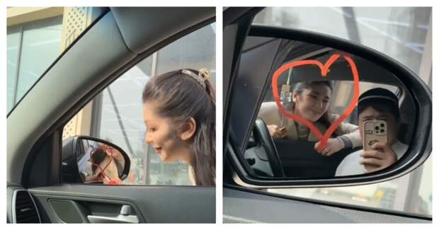 Девушка нарисовала сердце на боковом зеркале автомобиля своего парня и решила сделать оригинальную совместную фотографию.