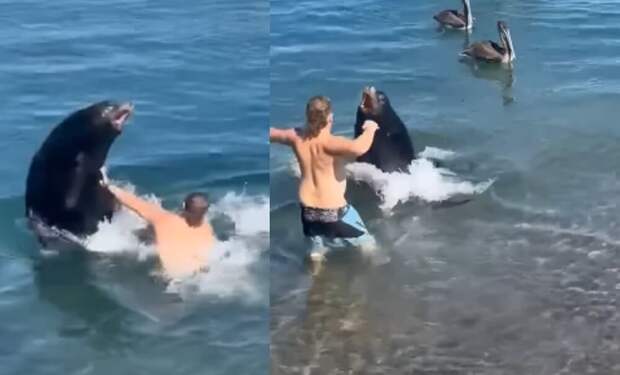 Неизвестный мужчина снял солнцезащитные очки и зашел в воду, а зрители ободряли его криками вроде "иди поплавай на его спине" и "не волнуйся, медицина здесь дешевая".