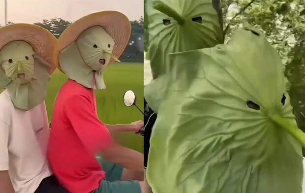Маски из листьев лотоса набирают популярность у любителей двухколёсного транспорта в Китае. Люди используют их для защиты от солнца. Идею показали две велосипедистки, и теперь её подхватили другие пользователи.