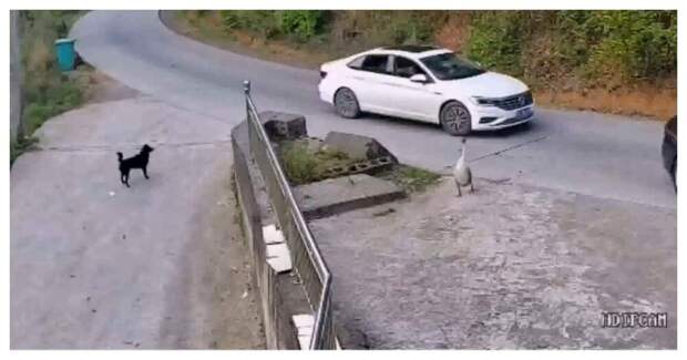 Камера наблюдения, установленная в китайском населенном пункте, запечатлела погоню пса за гусём. Домашняя птица, удирая от преследователя, врезалась в проезжающий мимо автомобиль.