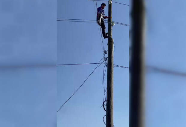 Кошка забралась на самый верх опоры линий электропередач, а спустить обратно не смогла. На помощь ей пришли работники Левашинских районных электростанций.