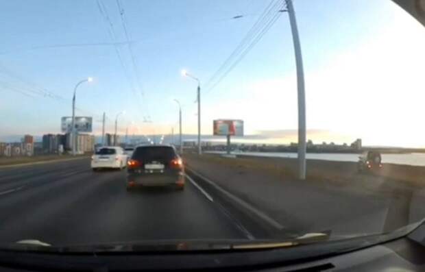 В Иркутске водитель на внедорожнике Мицубиси пытался объехать пробку и завершил манёвр именно так, как и должно быть.