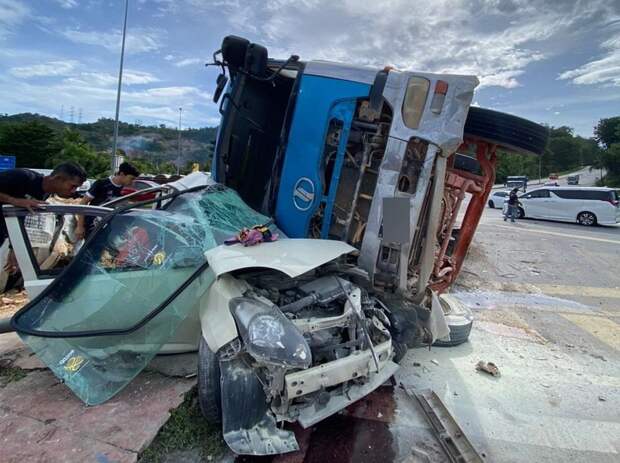 В Кланге, Малайзия, перевозивший грунт грузовик протаранил мусоровоз и два легковых автомобиля "Перодуа Муви", после чего опрокинулся. Удивительно, но обошлось без жертв. Травмы получили четыре человека.