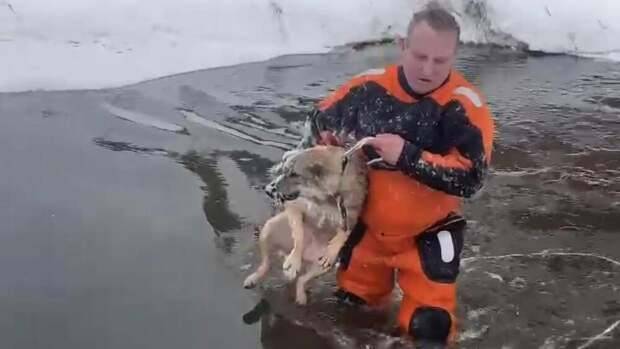 В Павловском Посаде женщина выгуливала свою собаку и вдруг услышала чей-то жалобный вой. Женщина пошла на него и увидела барахтающегося в ледяной воде пса. Вытащить животное самостоятельно не вышло, и она вызвала спасателей.