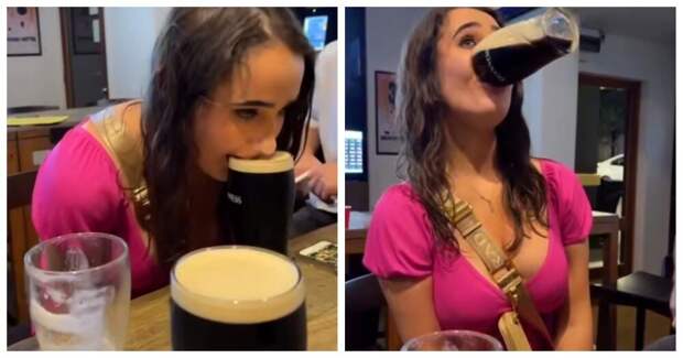 Неудачная попытка девушки выпить пиво из бокала без помощи рук.
