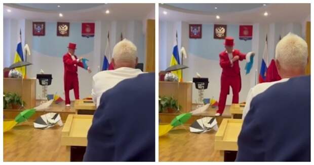 В администрации Зимовниковского района Ростовской области выступил человек в цилиндре и красном костюме. Он показывал присутствующим фокусы.