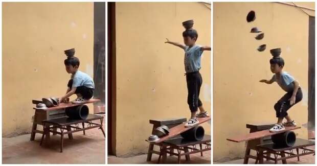 Мальчик мастерски балансирует и ловит подкинутые им же предметы.