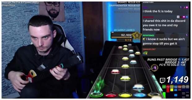 Песня "Through the fire and flames" пауэр-метал-группы Dragon Force является самой сложной композицией в ритм-игре Guitar Hero и уже давно стала среди фанатов своего рода челленджем. Геймер под ником CarnyJared первым в мире прошёл её на скорости 200% и без единой ошибки.