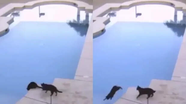 Кот напугал своего соплеменника и вынудил его принять незапланированные водные процедуры.