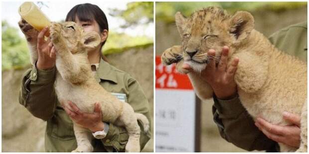 Смотрители зоопарка в Китае опубликовали милейшие кадры со львёнком, который уснул на руках у смотрительницы.