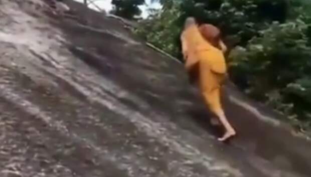 Монах легко и непринужденно поднимается по крутому склону, в то время как автор видео думает, как же ему быстрее забраться наверх с помощью верёвки.