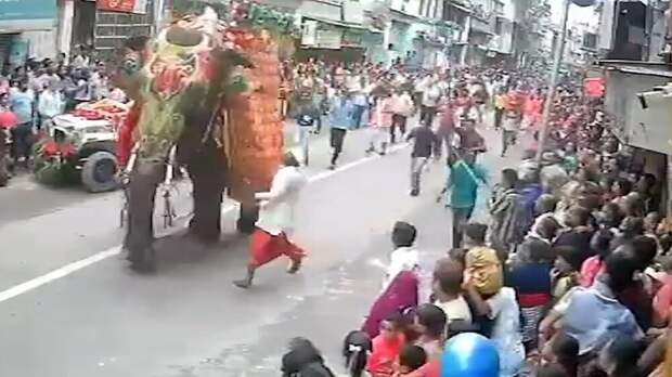 Во время празднования ежегодного фестиваля Ратха-йатра в индийском городе Ахмадабад один из участвовавших в шествии слонов внезапно бросился в толпу. Несколько человек оказались сбиты с ног и попали под лапы животного. На кадрах видно, как люди в панике разбегаются, а другие бросаются на помощь пострадавшим.