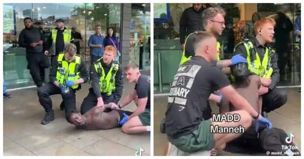 В Великобритании, чтобы предотвратить плевки находящегося под сильным наркотическим воздействием темнокожего молодого человека в окружающих, сотрудники полиции аккуратно использовали специальное средство защиты для лица.